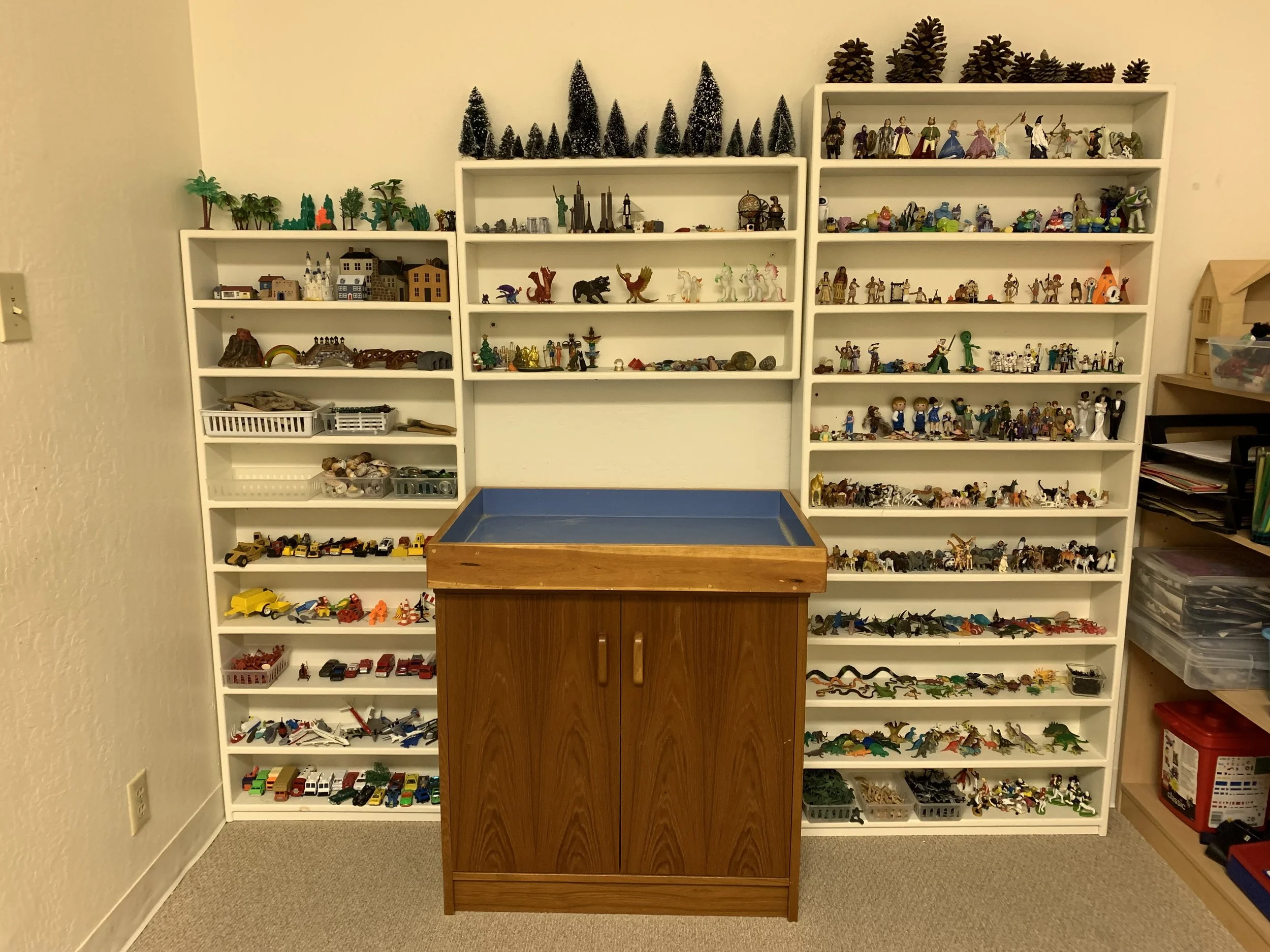 Complete sand tray set-up: tray, sand, cabinet underneath (great for storage), shelves, figures, $400.