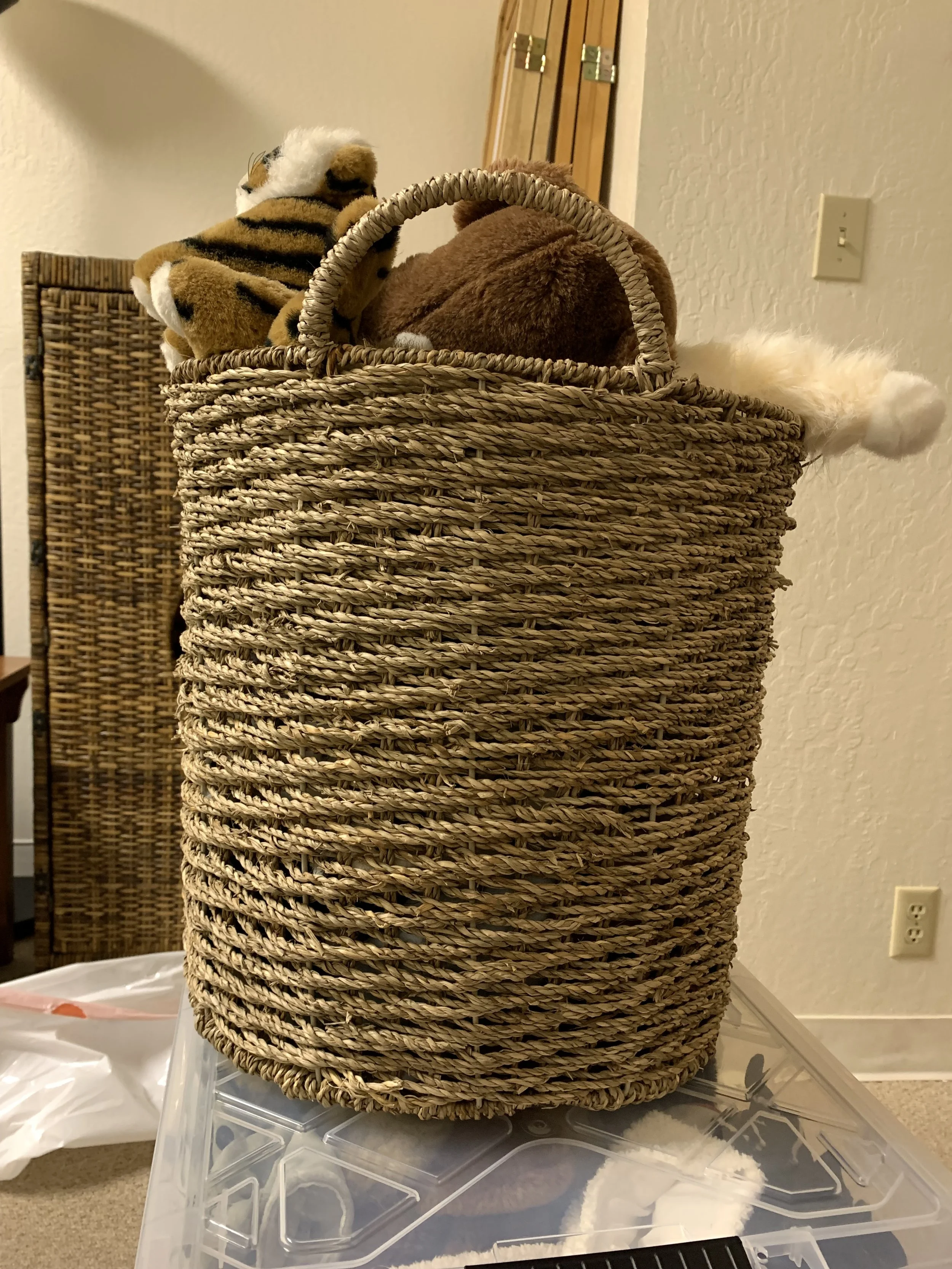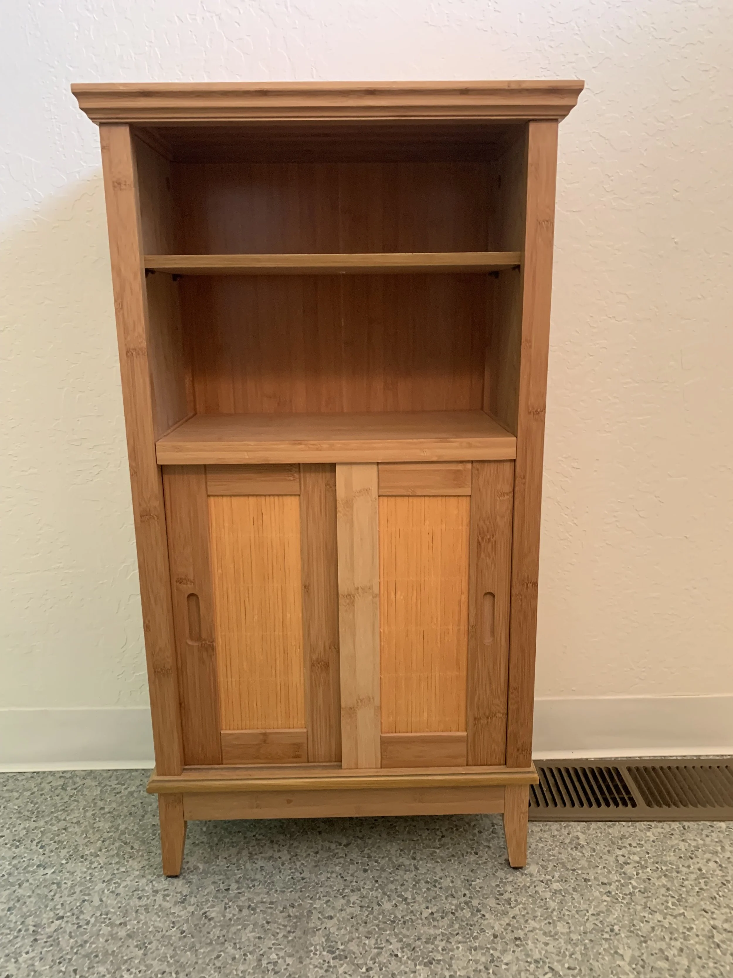 Rattan cabinet, great for storing toys, not very heavy to move, 21” wide, 16” deep, 48” tall, $50