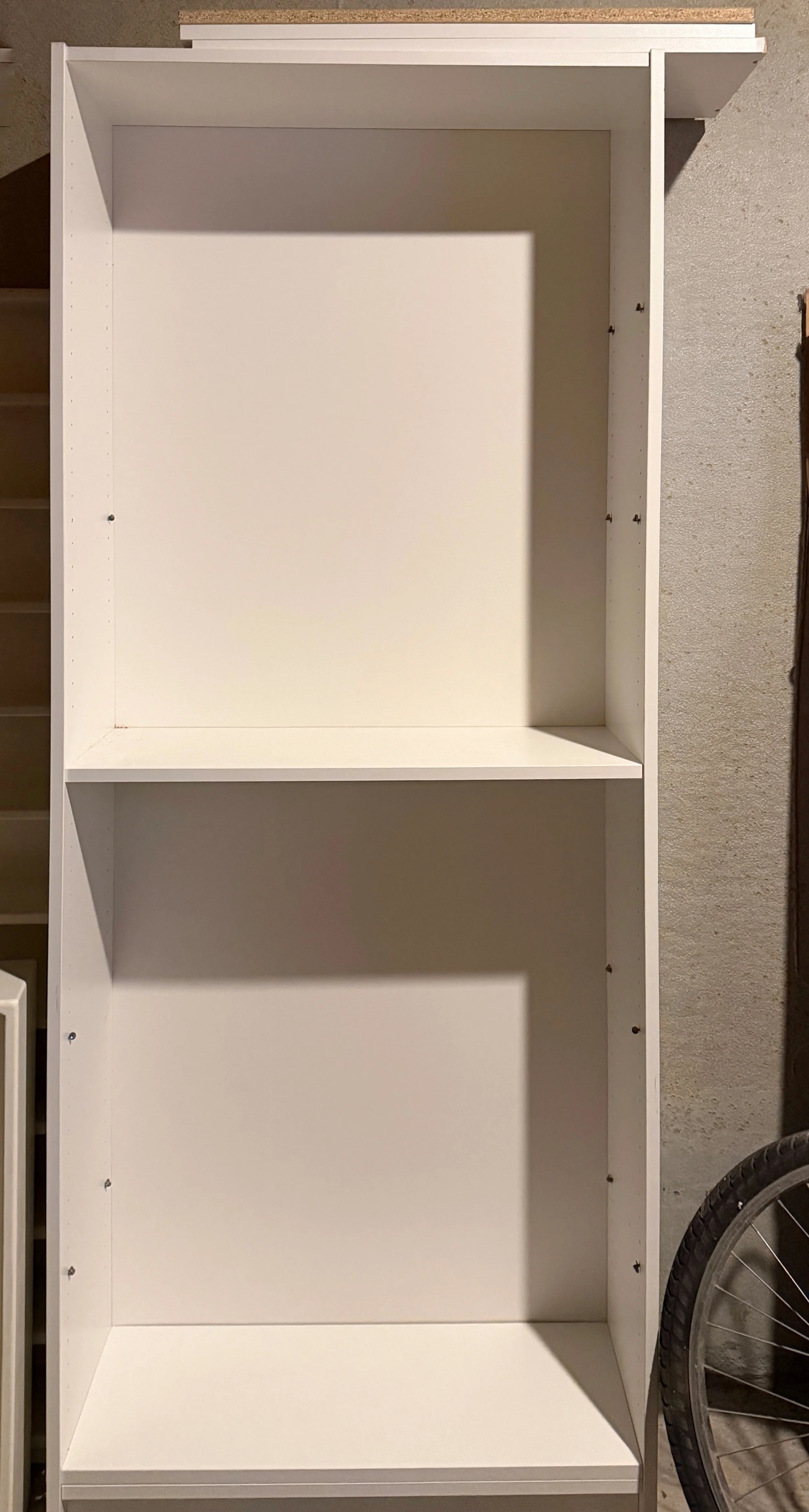 3-shelf melamine bookcase, 44”tall x 28” wide x 12” deep, $20