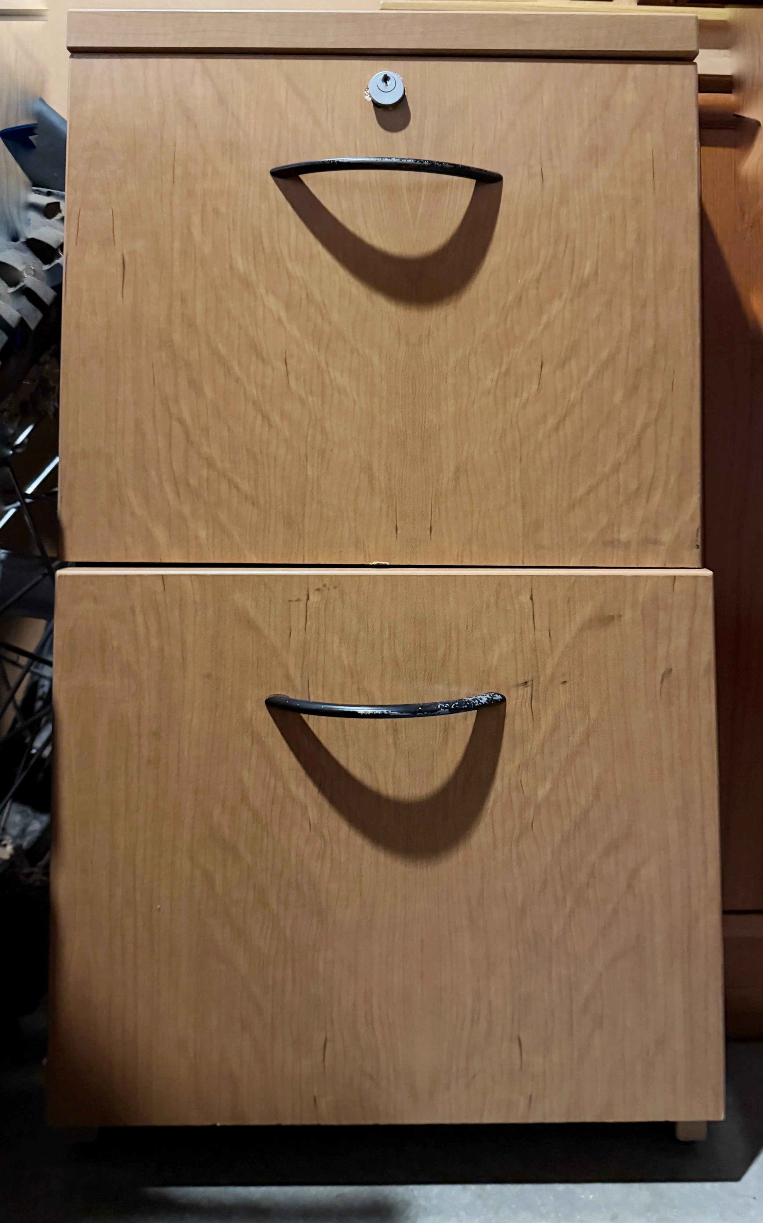 Locking wooden file cabinet, uses hanging folders (some included), 29” tall x 16” wide x 24” deep, $100